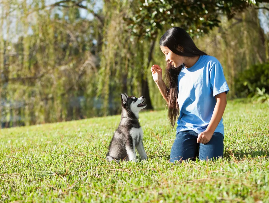 - Commandotraining: gebruik duidelijke en consequente commando's wanneer je je puppy nieuw gedrag aanleert. Als je je puppy bijvoorbeeld 'zit' leert, wacht dan tot hij vanzelf gaat zitten en beloon en prijs hem dan meteen.