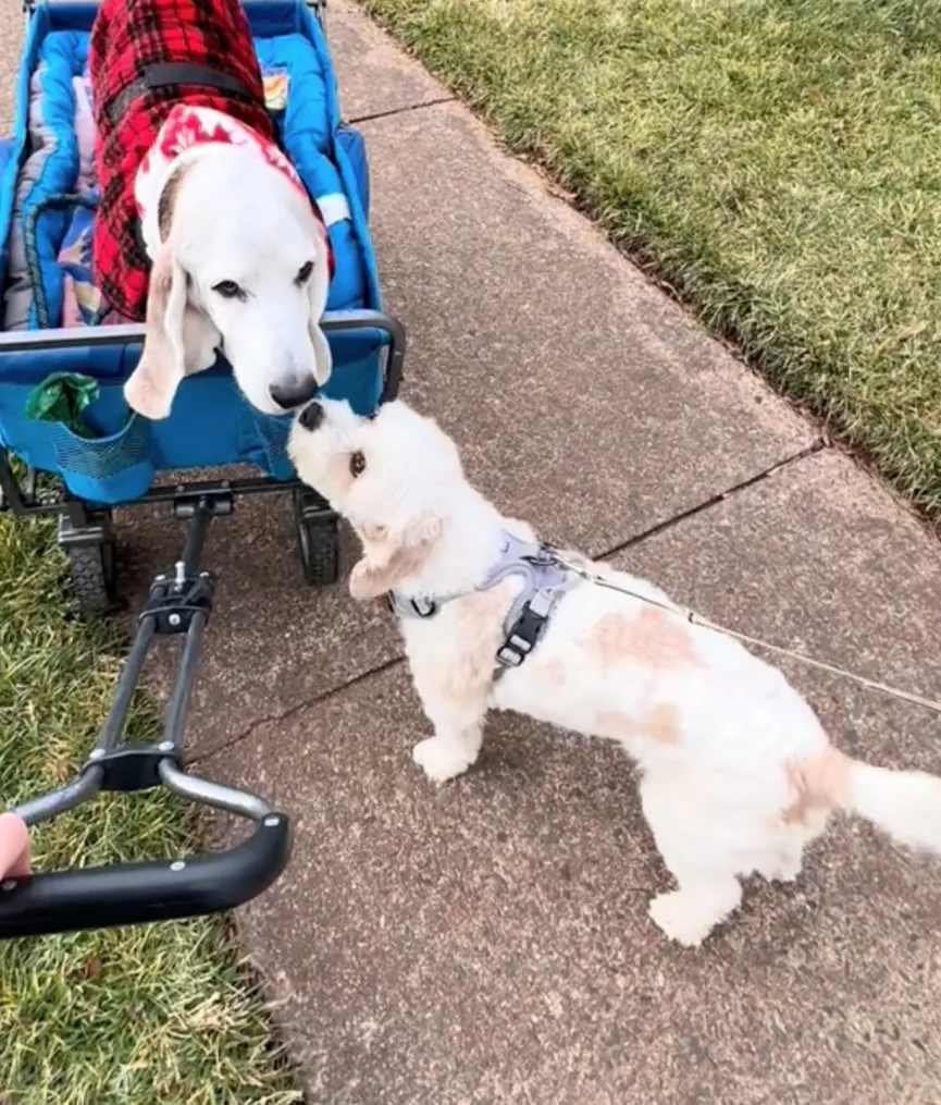 Hartverwarmende reünie van senior hond Errol met vriend Romeo