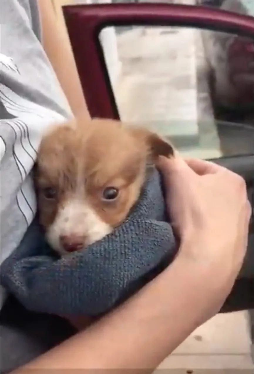 Op een trieste dag werd een puppy alleen achtergelaten op een drukke straat.